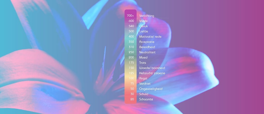 Stel je voor dat emoties geen losse ervaringen zijn, maar energie die door je lichaam stroomt en jouw trilling vormt. Hawkins’ schaal van bewustzijn beschrijft dit als een reeks frequenties van 0 naar 700+, waarin lagere emoties zwaar en verdiepend voelen en hogere frequenties zoals liefde, vreugde en vrede je licht, open en verbonden laten voelen, liefde ligt rond 500 en hoger als een staat van open hart en overvloed. Rond de 200 hz ligt het kantelpunt, het vraagt namelijk moed om aan de slag te gaan met jouw lage emoties en af te stemmen op de hogere.
