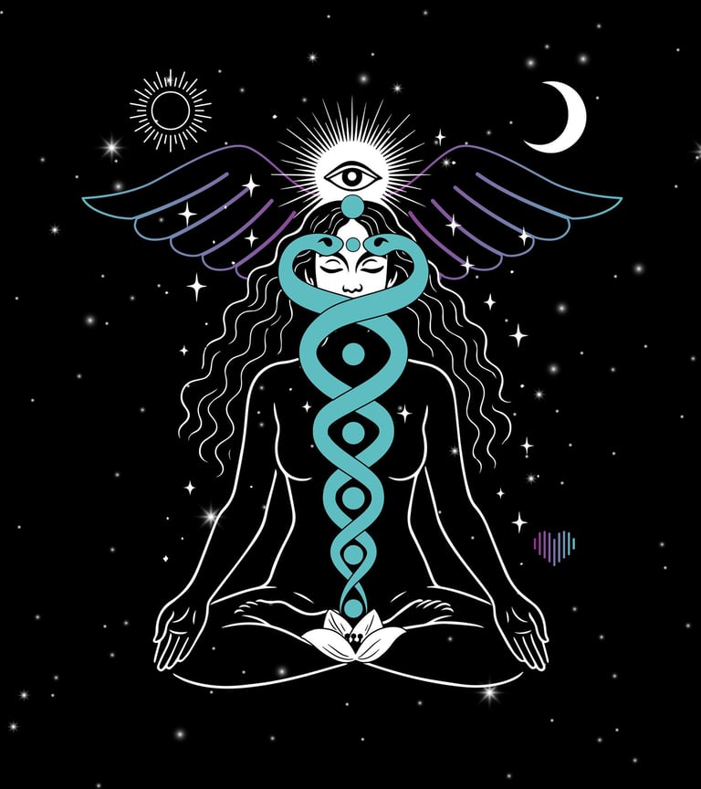 Vanaf de basis kan deze energie, wanneer zij zich ontplooit, via het centrale energiekanaal (Sushumna nadi) omhoog stromen door de ruggengraat, kruiselings langs de chakra’s, als een soort HelixDNA-vorm. Wanneer de Kundalini vrij komt, opent dit een krachtig proces van transformatie, bewustwording en heling.